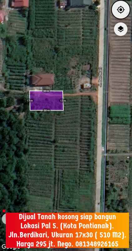 Dijual Tanah kosong siap bangun, Lokasi Pal 5. (Kota Pontianak). Jln.Berdikari, Ukuran 17x30 ( 510 M2). Harga 295 jt. Nego. 081348926165