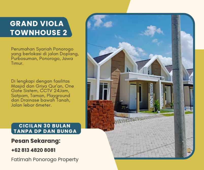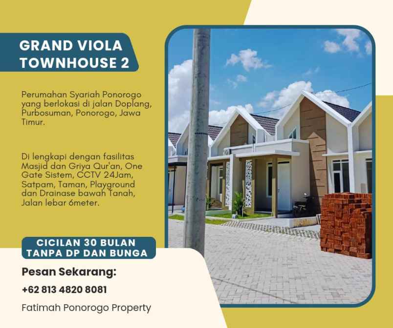 Rumah Syariah Grand Viola Townhouse jadi pilihan tepat dengan lingkungan yang Aman, Nyaman, Asri dan bebas banjir. Berada di Doplang, Purbosuman, Ponorogo, Jawa Timur.