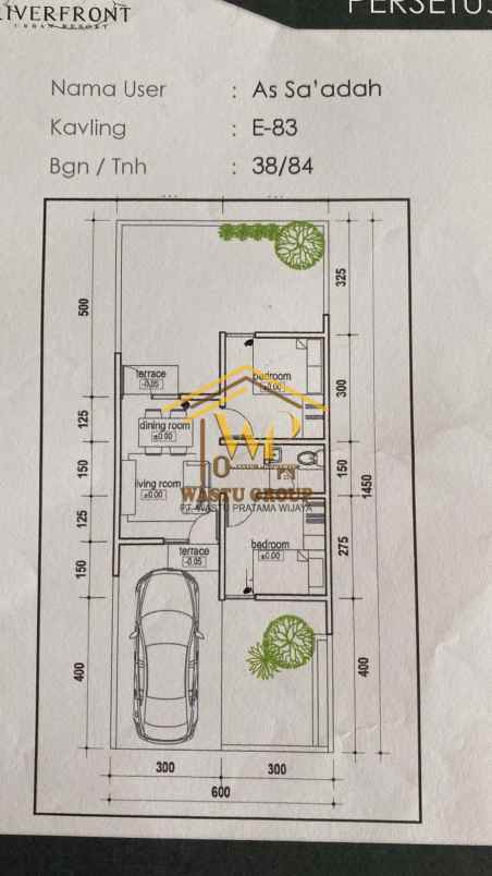 Luas bangunan 38m2 dan luas tanah 84m2, ideal untuk keluarga kecil.