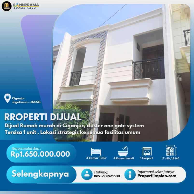 Dijual Rumah murah di kawasan Ciganjur, di cluster dengan one gate system. Tersisa 1 unit. Lokasi strategis ke semua fasilitas umum