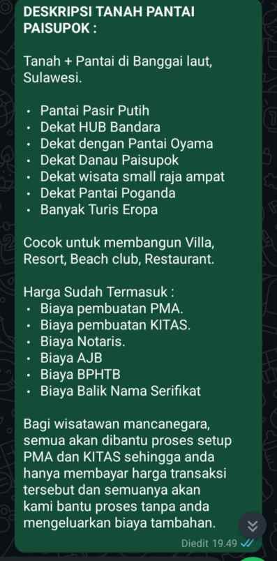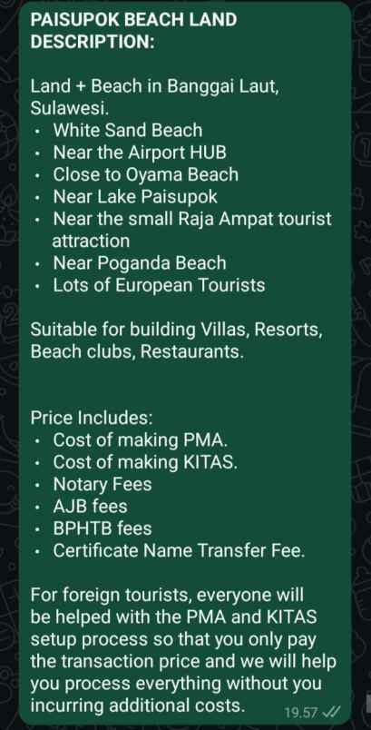 Bagi wisatawan mancanegara, semua akan dibantu proses setup PMA dan KITAS sehingga anda hanya membayar harga transaksi tersebut dan semuanya akan kami bantu proses tanpa anda mengeluarkan biaya tambahan.