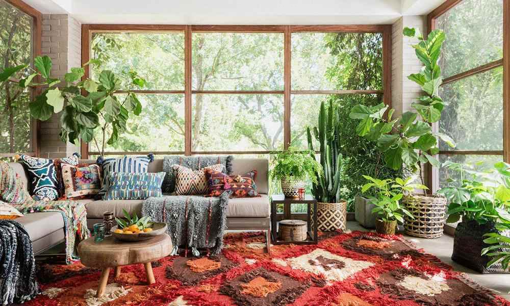 Umumnya, rumah bohemian mengusung tema alam yang bebas sehingga terlihat lebih estetik. Anda bisa memanfaatkan perpaduan karpet yang cerah dengan tanaman hias yang cocok. Pilih tanaman dengan daun yang tidak mudah rontok agar mudah perawatannya.